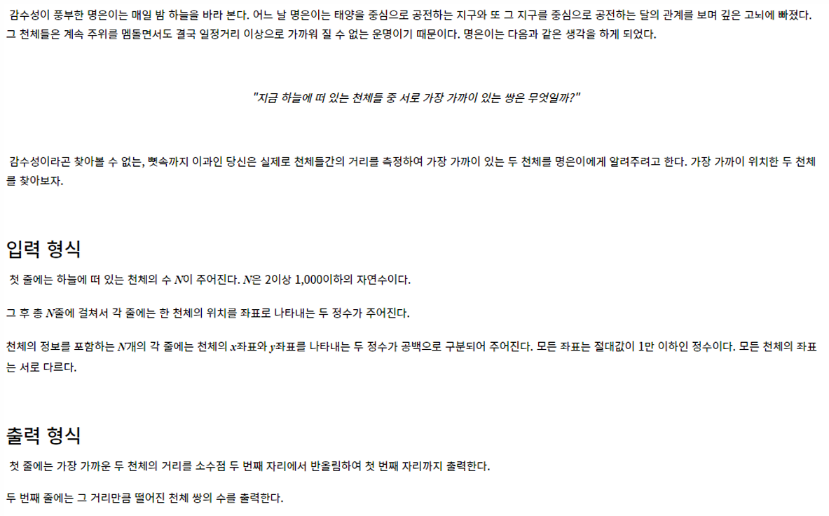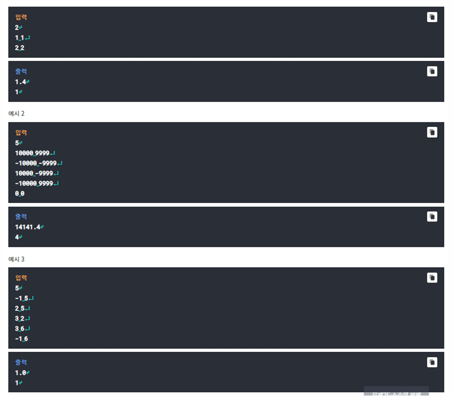//가장 가까운 두 천제 사이 거리 소수점 두번째자리 반올림 출력