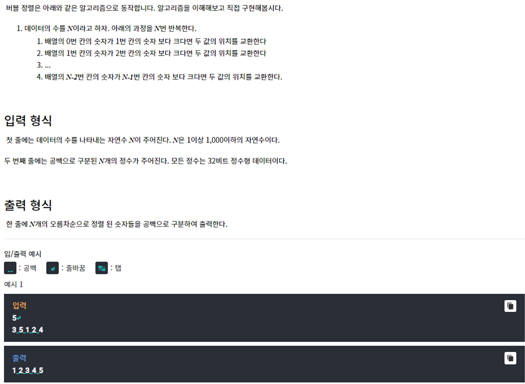 - 따라서 내부 for문은 j < (n-i)까지 루프를 돌게하여, 이미 정렬된 (n-i)번째 원소는 비교에 포함하지 않게 해준다.