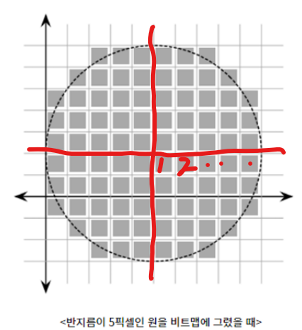//원은 대칭이므로 4등분해 1사분면*4로 계산해도 총 픽셀 수 계산 가능