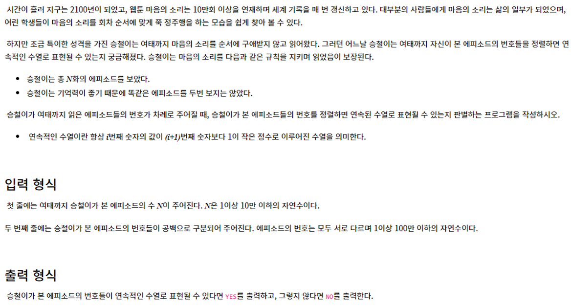 - 이 문제는 입력받은 n개의 정수를 정렬했을 때 arr[i+1] - arr[i] == 1가 된다면 연속된 수열로 표현할 수 있다고 판단한다.