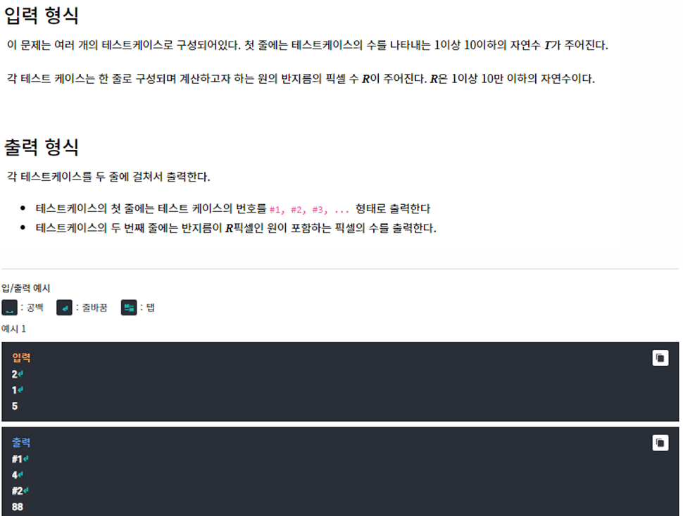 //T개의 반지름 R을 입력받고 해당 원에 들어갈수 있는 픽셀 수 출력