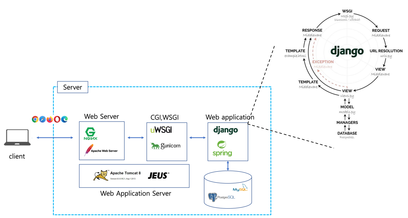 스크립트 언어 진영에 따라서 사용하는 Web Application의 종류가 다른데, Python은 Django를, Java는 Spring이 있다. 구체적으로 어떠한 동적 웹 페이지를 구현할지를 코드로서 작성하게 구현하게 된다.