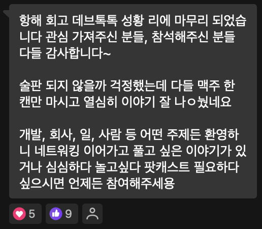후반부로 갈수록 이미 친해진 사람들끼리만 어울리는 분위기가 생겼고, 개발 이야기는 줄어들며 자연스럽게 친목 중심으로 흘렀다.