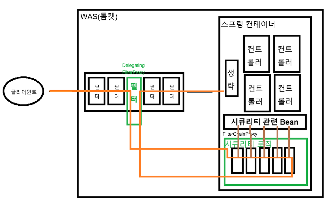 - 해당 요청은 스프링 컨테이너 내부에 구현되어 있는 스프링 시큐리티 감시 로직을 거친다