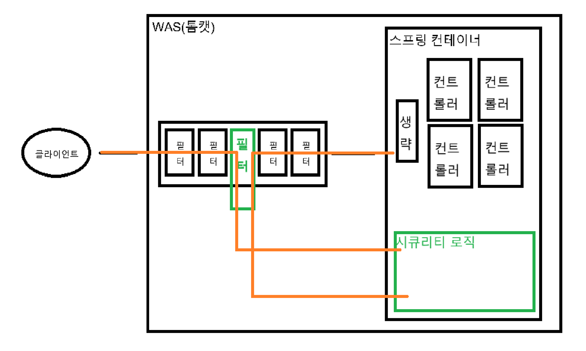 - WAS의 필터에 하나의 필터를 만들어서 넣고 해당 필터에서 요청을 가로챈다