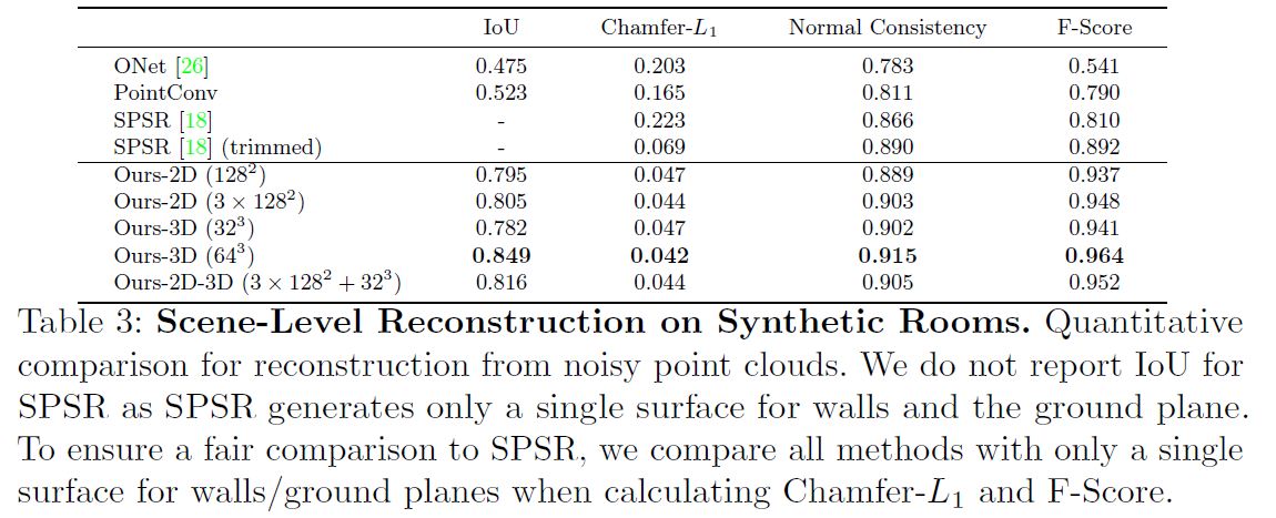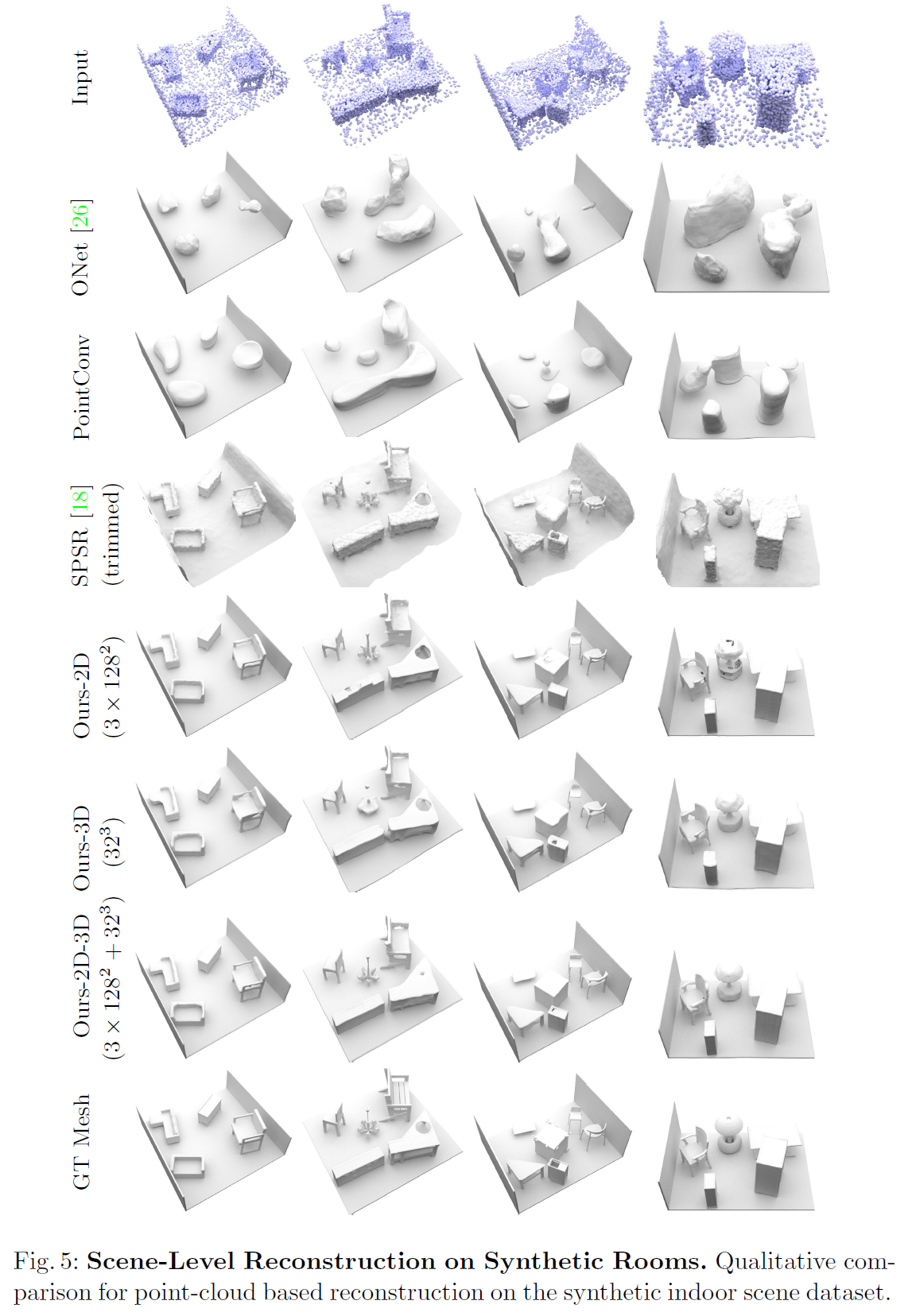 연구팀은 제안한 방법이 **더 큰 장면(scene)**에도 확장 가능함을 평가하기 위해, 합성된 실내 장면 데이터셋을 사용해 포인트 클라우드 기반 3D 재구성을 수행했습니다.
