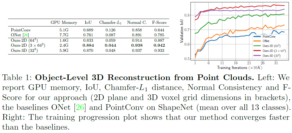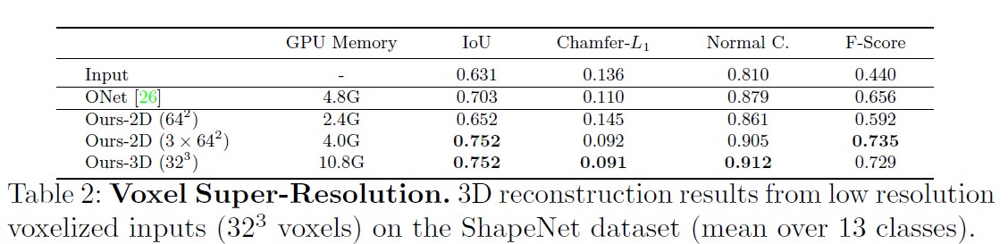 학습 시 감독(supervision)을 위한 쿼리 포인트 수는 포인트 클라우드의 경우 2048개, 복셀의 경우 1024개를 사용했습니다. 각 입력에 따라 다른 인코더 구조를 사용하며, 배치 사이즈는 각각 32와 64로 설정했습니다.