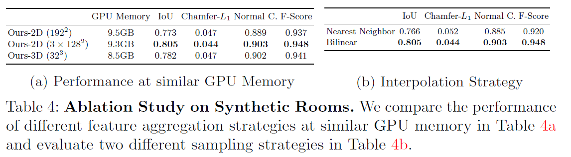 제안한 모든 방법이 장면의 기하학적 디테일을 잘 복원하고 부드러운 표면을 생성함.
