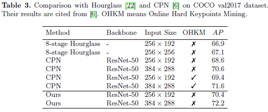 - CPN이나 Hourglass 같은 기존 방법보다 같은 조건에서는 더 높은 성능
