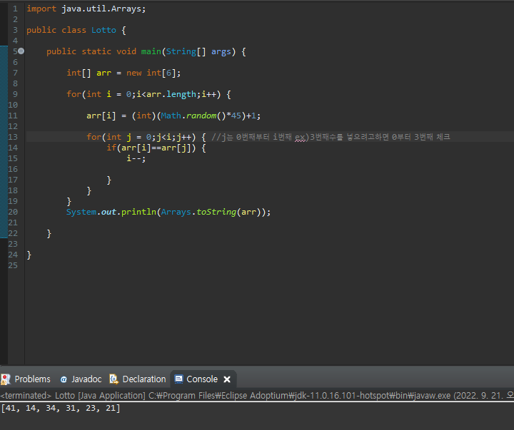 Math.random()*45는 0부터 44까지의 값을 반환한다. 그러므로 +1을 해줘야 1~45범위가 나온다