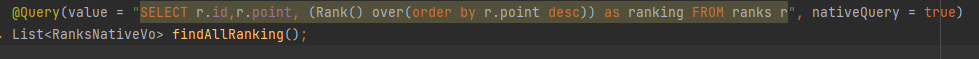 그리하여 처음 써보는 nativeQuery , 열심히 구글링을 해서 쿼리를 만들고 dto 맵핑을 하고 값을 확인해 보니 ranking이 계속 null 값이 나왔다...
