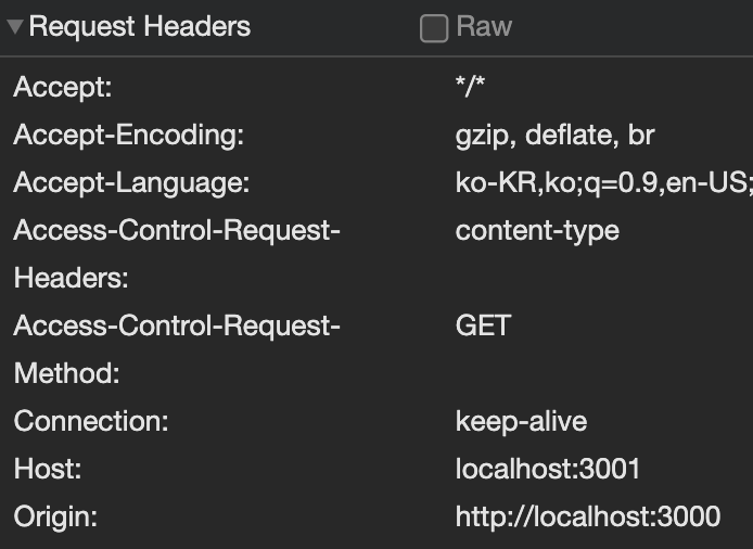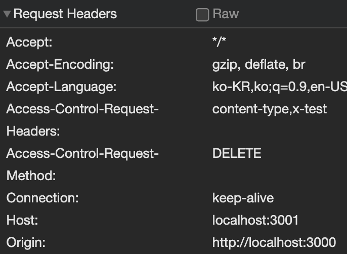 - 위 사진은 DELETE 요청에서 Content-Type: application/json 헤더를 실었을 경우의 사전 요청(preflight 요청) 헤더입니다.