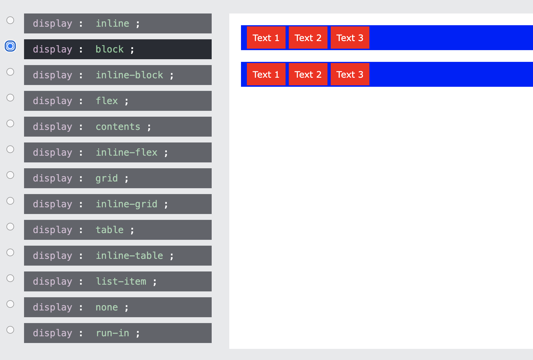 block은 엘리먼트가 위치한 칸 전체를 차지하고 있는 것을 볼 수 있다. 자연스럽게 그 다음 엘리먼트는 다음 줄로 내려가게 된다.