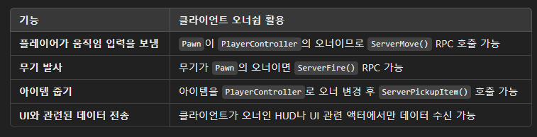 - Pawn (또는 Character) 자신을 조종하는 PlayerController Server RPC 가능