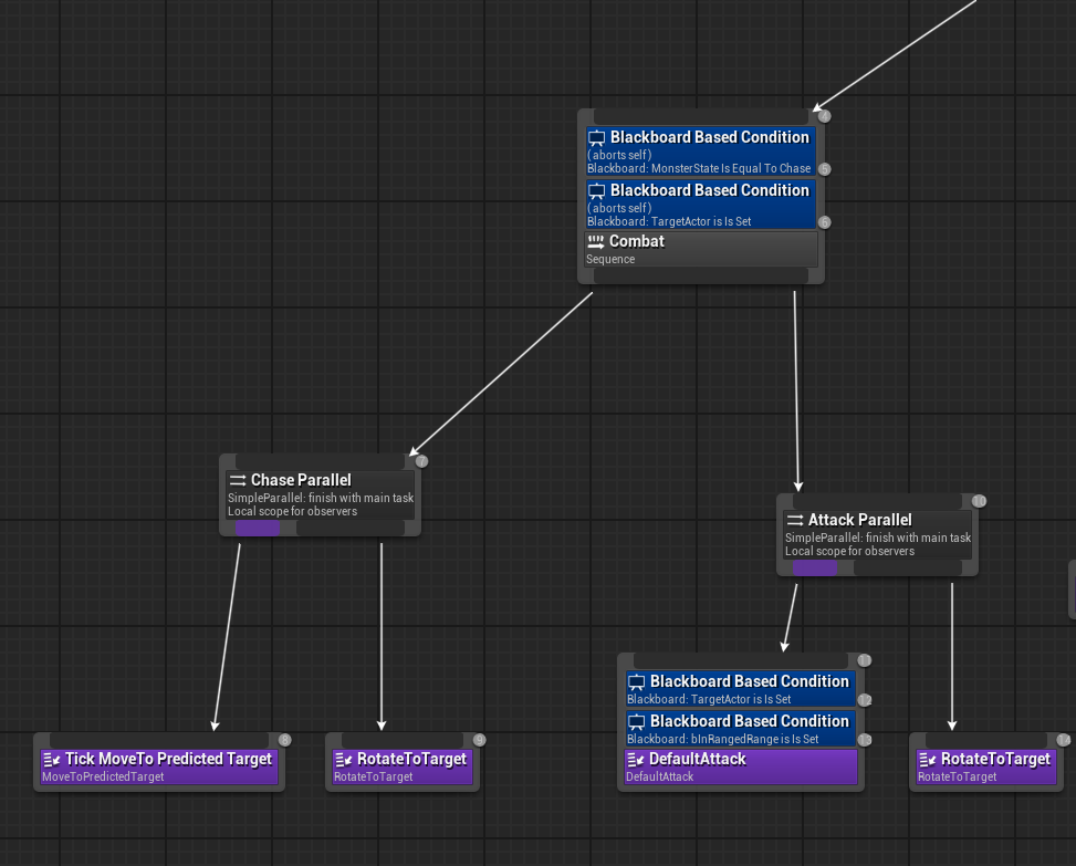 단순히 AI 의 움직임에 있어서 MoveTo Task를 이용해 AI 가 해당 방향으로 움직이면서 자연스럽게 Rotate를 할 수 있도록 Simple Parallel - Move To, Rotate To Location 이런 식으로 활용을 했음.