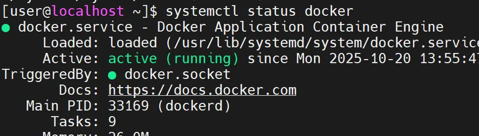 uid=1000(user) gid=1000(user) groups= ... 996(docker) ...