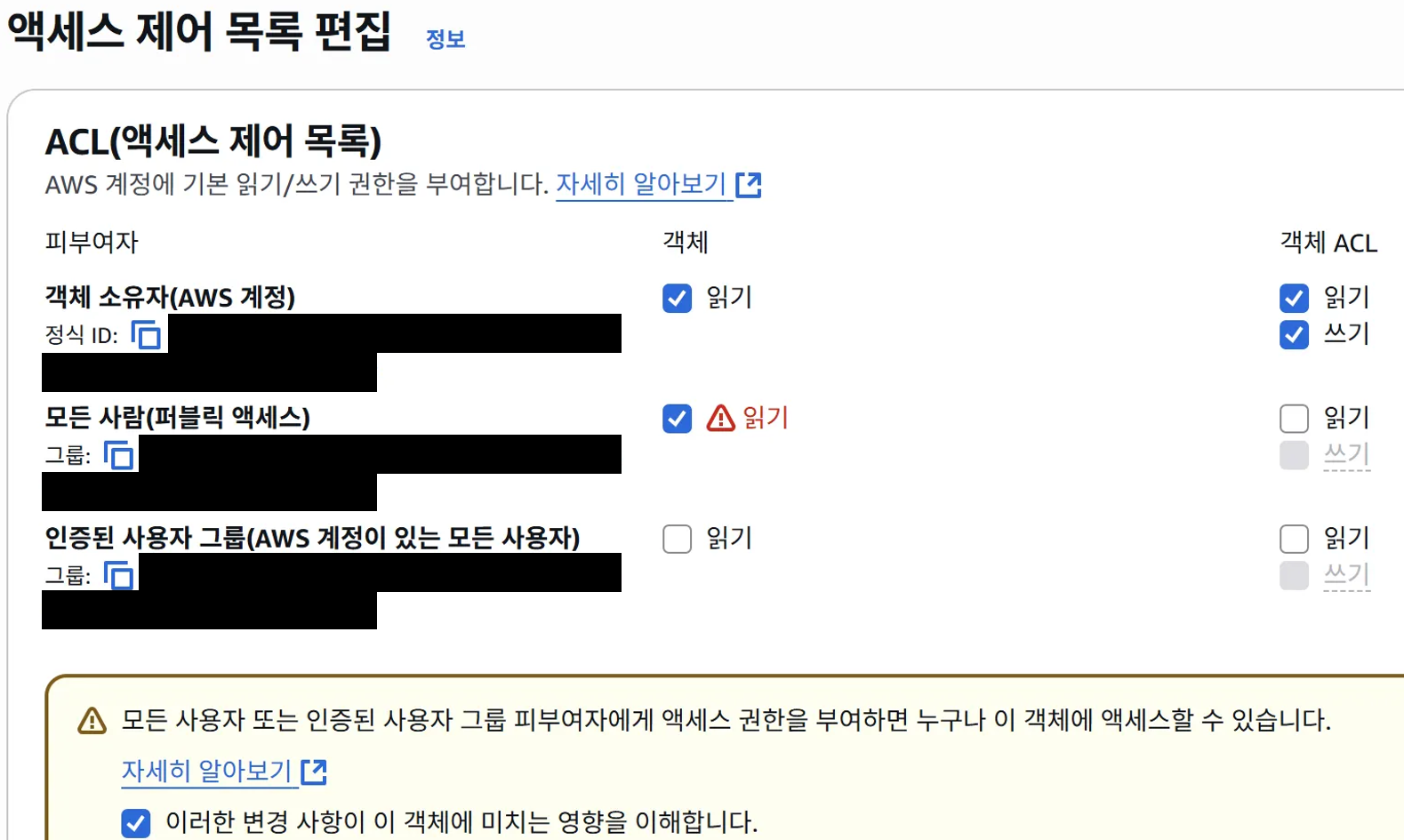 이를 이렇게 퍼블릭으로 오픈해버리면 스캔이나 크롤링 당해서 URL로 버킷이 노출될 수 있다.
