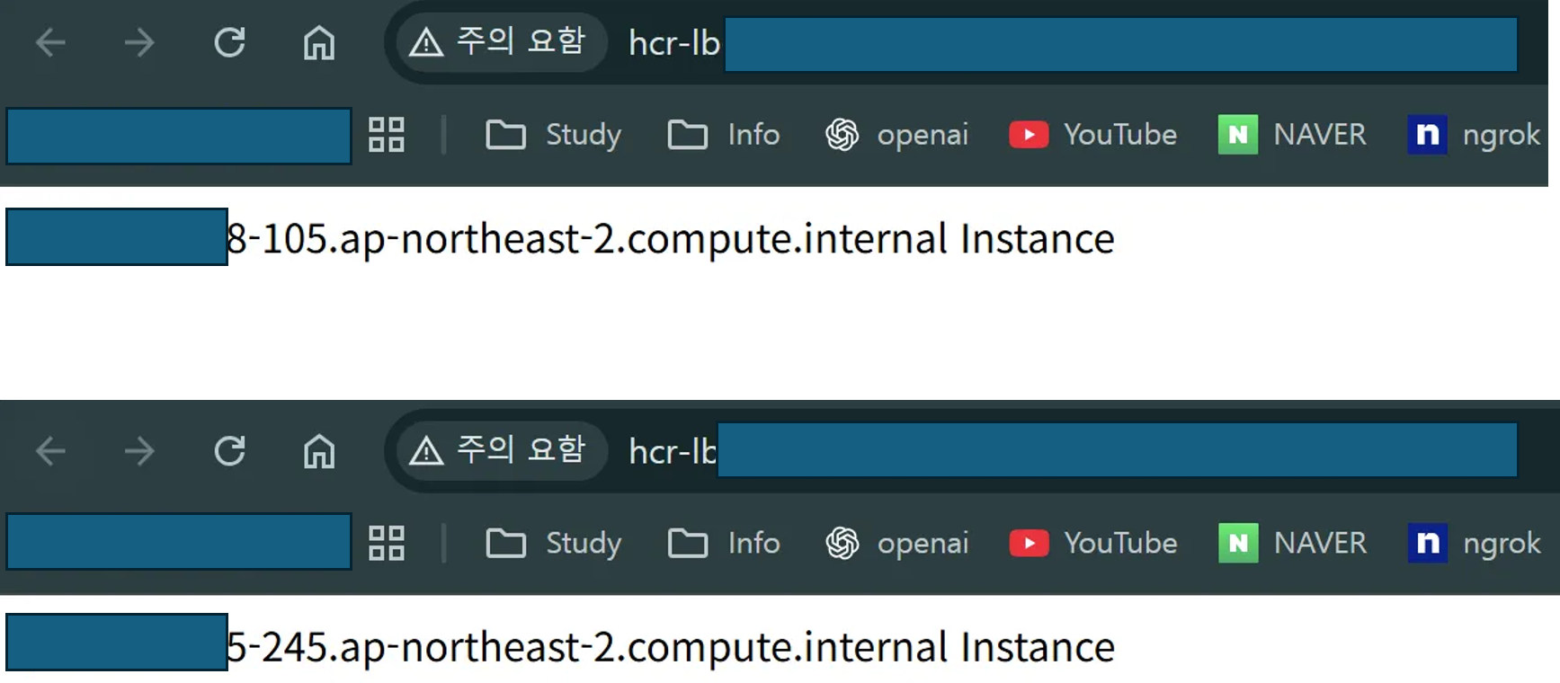 같은 도메인을 새로고침할 때마다 인스턴스가 바뀌며 로드밸런싱이 되는 것을 확인.