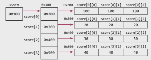 Ex2) score[0][0] = 100; // 배열 score의 1행 1열에 100을 저장