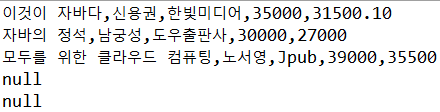 {"title":"이것이 자바다", "author":"신용권, "publisher":"한빛미디어", "price":35000, "discountPrice":31500, "stock":10},