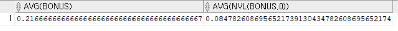 SELECT AVG(BONUS),AVG(NVL(BONUS,0)) --