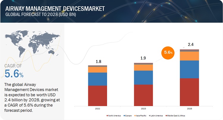 The global airway management devices market growth forecasted to transform from USD 1.9 billion in 2023 to USD 2.4 billion by 2028, driven by a CAGR of 5.6%. The growth in this market is attributed to the increasing demand for airway management devices in developing countries, the rise in surgical procedures, and the growing prevalence of chronic respiratory diseases such as asthma and COPD. However, the lack of reimbursement policies in emerging countries may challenge market growth. Conversely, the increasing demand for intensive care units presents growth opportunities for the market.