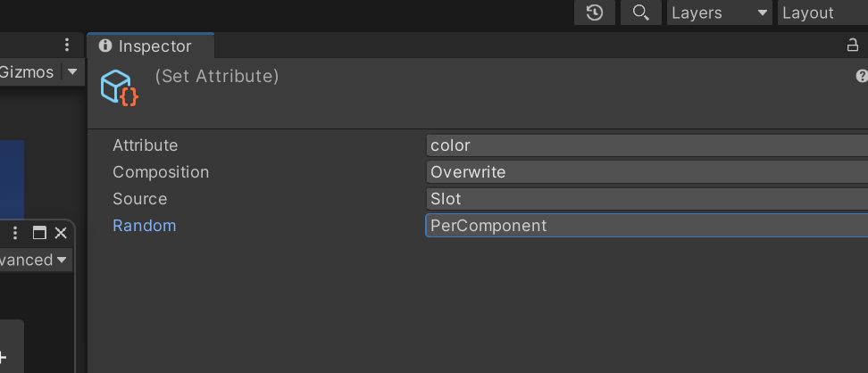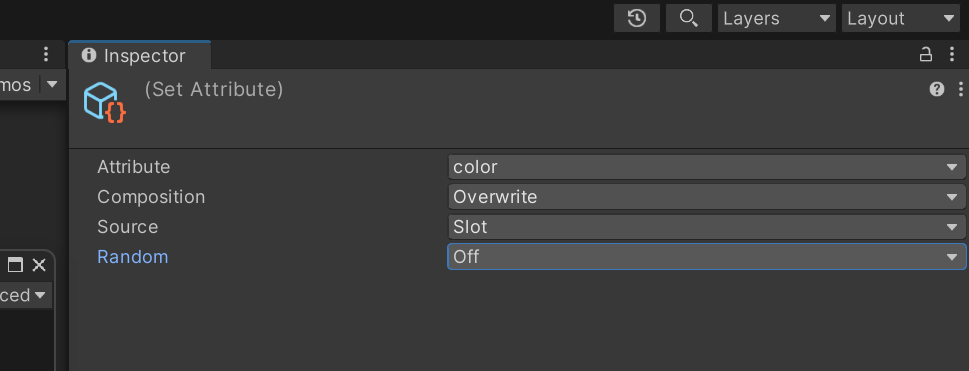 1번에서 사용한 set color를 클릭하고 유니티 inspector 창에서 Random을 PerComponent로 변경하면 블록이 랜덤을 위해