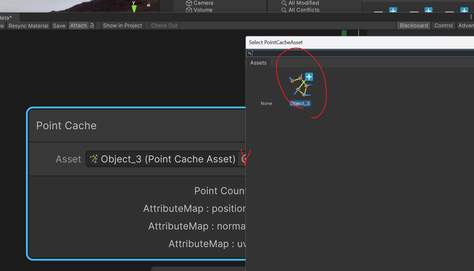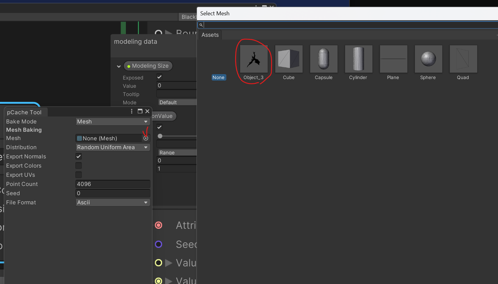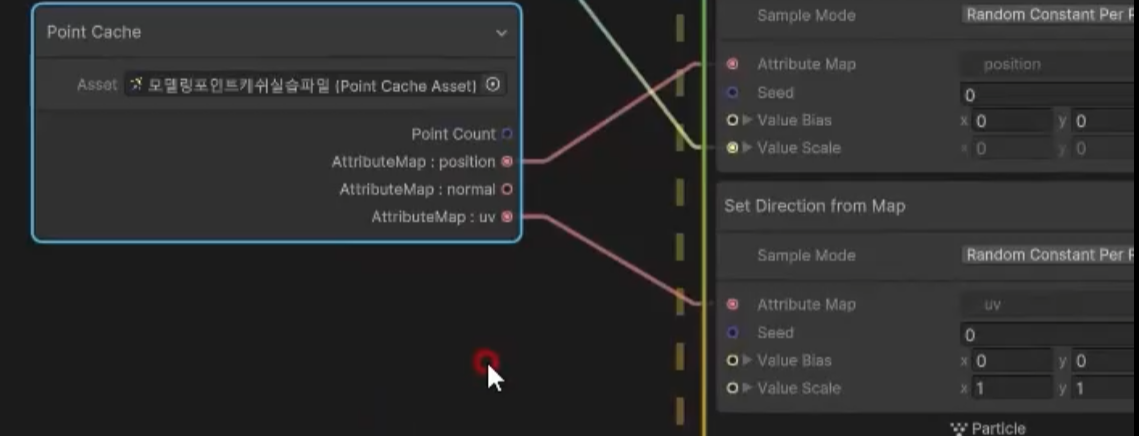 선택 가능한 것들: position, normal, uv 등. (Point Cache에 저장된 항목들 중에서)