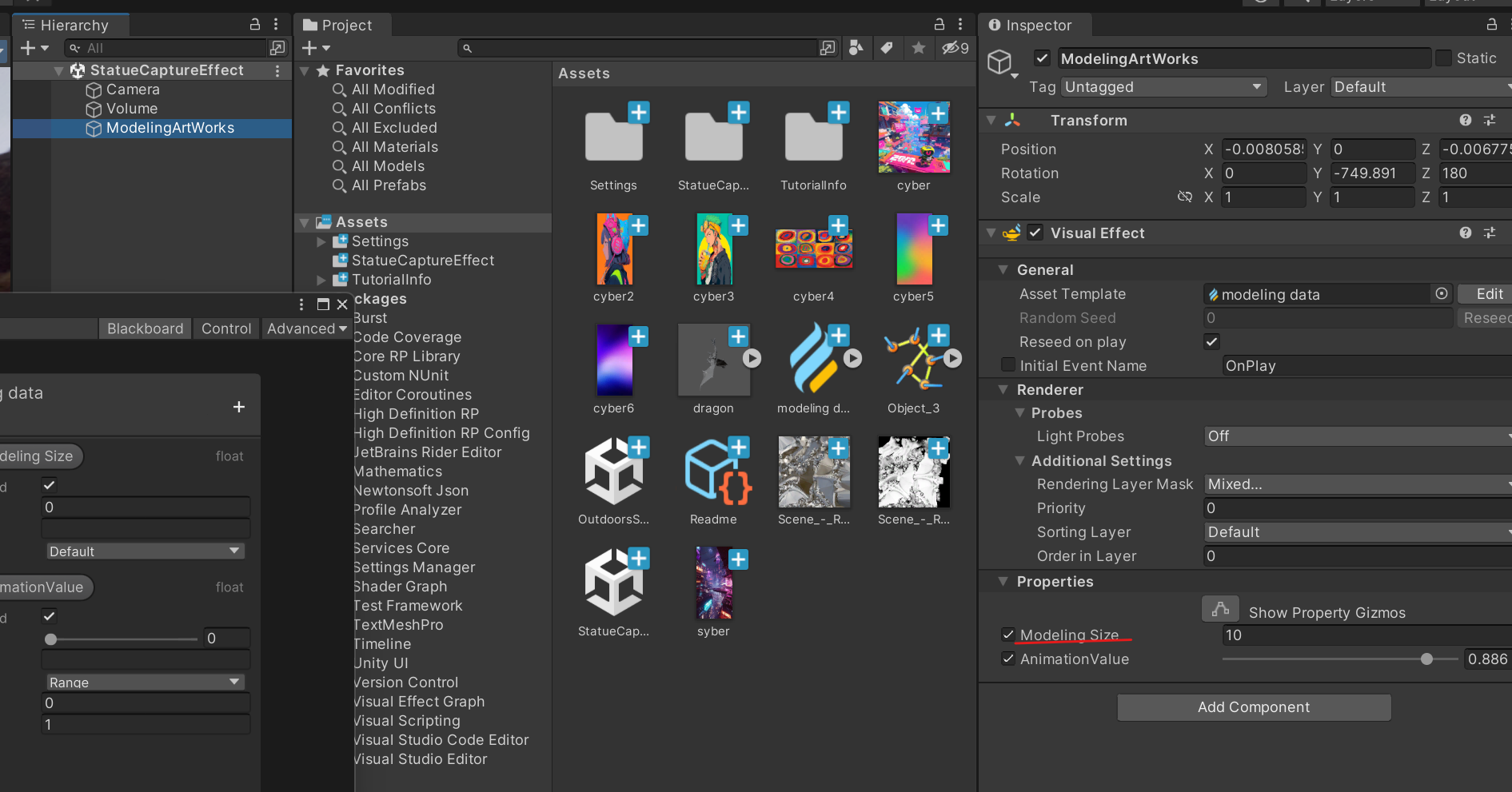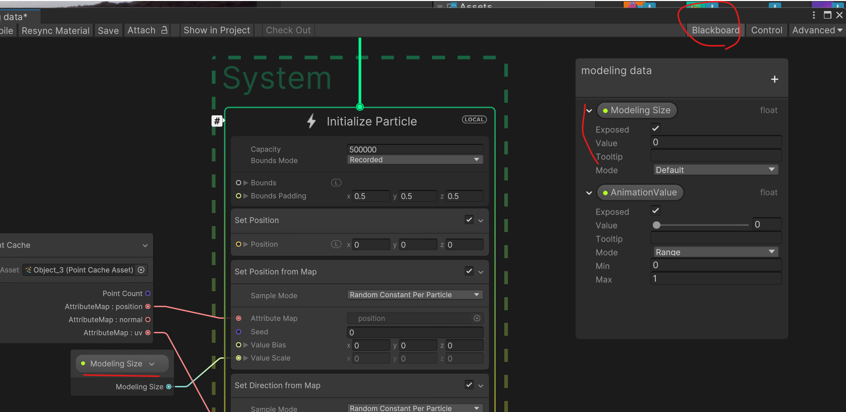Modeling Size라는 Exposed Parameter(인스펙터에서 조절 가능한 값)가 Value Scale 또는 다른 입력과 연결되어 있다.