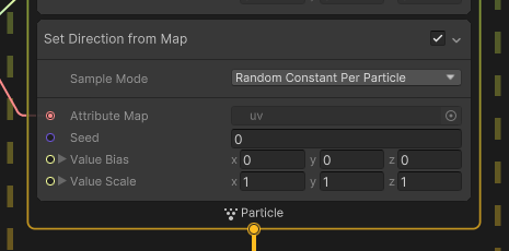 Sample Mode: Random Constant Per Particle 등. 각 파티클에 대해 방향을 어떻게 샘플할지 정함.