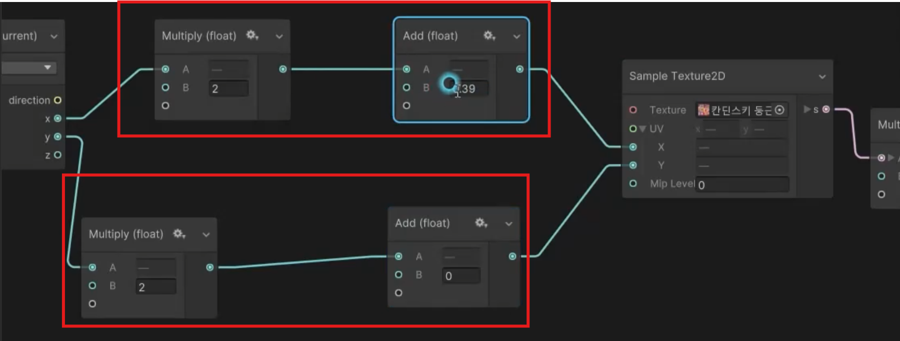 주의: uv는 보통 (0..1, 0..1) 범위라서 방향으로 쓰려면 Value Scale로 -1..1 범위로 변환하거나, Multiply/Add로 보정해야 한다.