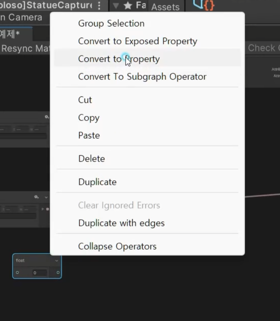 float 노드를 추가하여 오른쪽 마우스 - Convert to Property를 클릭