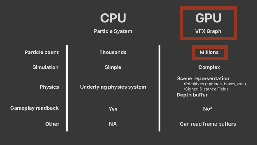VFX Graph는 GPU에서 계산됨 → 훨씬 많은 입자를 빠르게 처리 가능