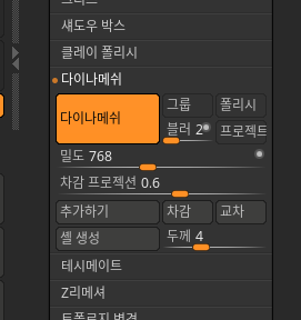 밀도를 어느정도 높이고(너무 높이지말자) 다이나 메쉬를 클릭해주면