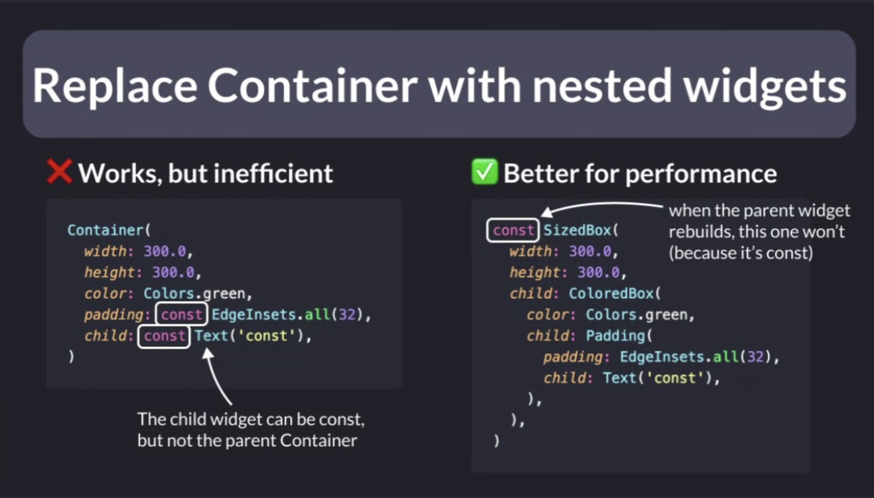 - 그리는 동안 컨테이너는 먼저 주어진 변화를 적용한 다 decoration장식(border,color)을 적용한 뒤 패딩 된 범위를 채운 다음 child를 페인팅하고 마지막으로 전경 장식 child 안에 있는 decoration을 페인팅하여 패딩 된 범위를 채웁니다.