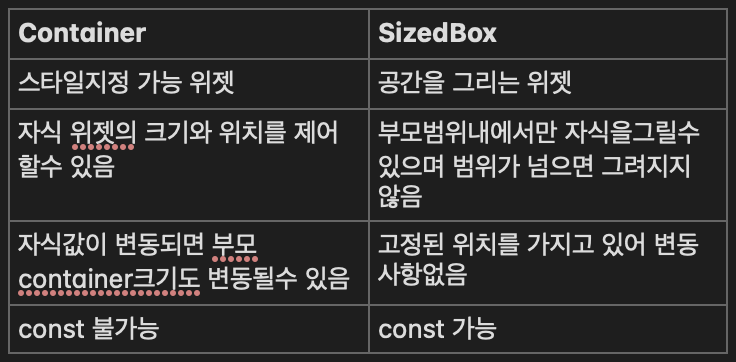 - 위젯에 자식, 높이, 너비, 제약 조건이 없고 부모가 무제한 제약 조건을 제공하는 경우 컨테이너는 가능한 한 작게 크기를 조정하려고 합니다.
