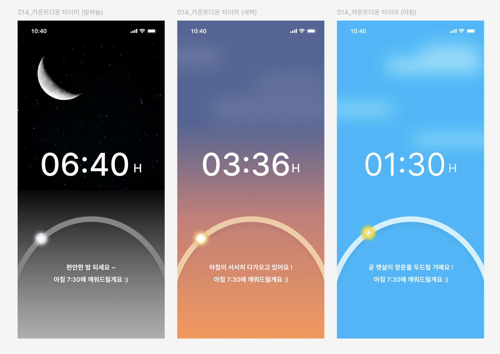 기상까지 남은 시간을 화면에 크게 보여주었고 처음에는 새벽과 아침에도 달 이미지를 함께 넣어보려 했지만 약간의 이질감과 촌스러운 느낌이 들어 밤하늘 화면에만 이미지를 적용했다