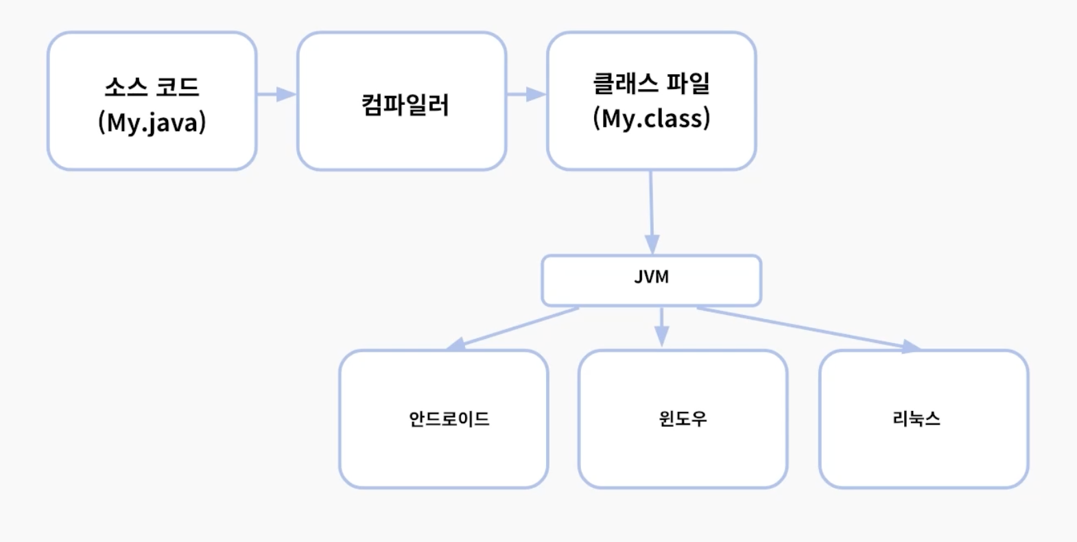 Java 프로그램은 JVM(Java Virtual Machine) 위에서 실행되므로, 운영체제(OS)에 상관없이 실행 가능함