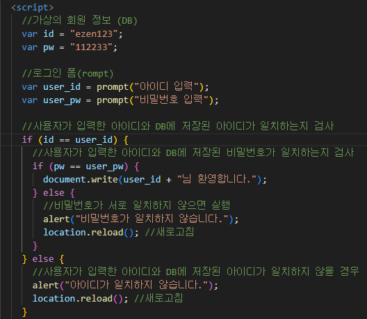 ✔️pw까지 일치하면 document.write가 출력되지만 일치하지 않으면(false) else문의 alert가 출력된다.