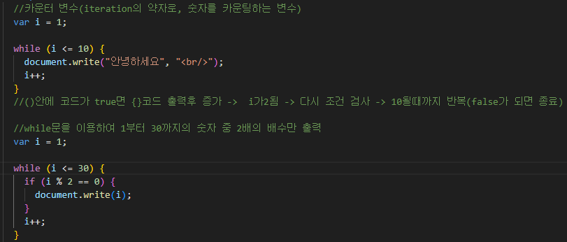 2. {}안에 있는 자바스크립트 코드와 증감식을 실행한다.