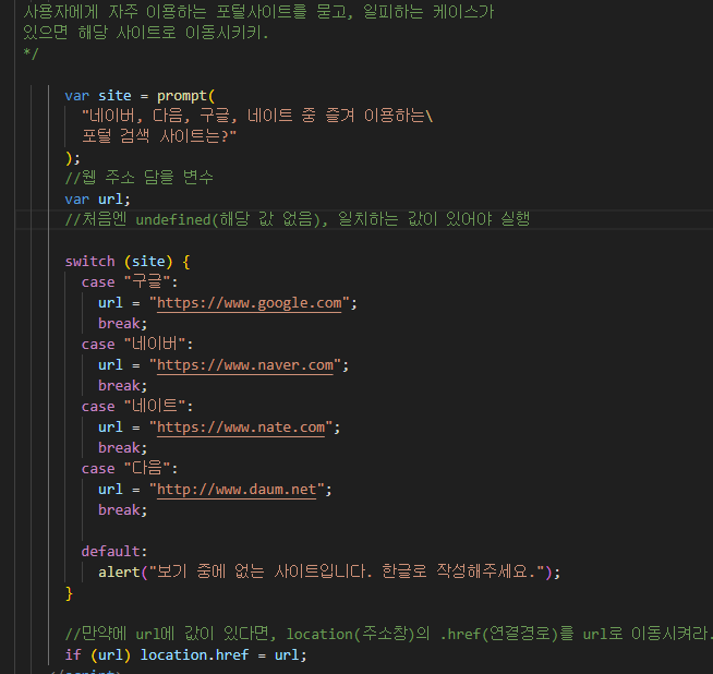 변수에 저장된 값은 switch문을 만나면 case의 값을 하나씩 검사한다. case의 값과 변수의 값이 일치하는 데이터가 있으면 그에 해당하는 코드를 실행시키고, 다음 줄의 break문을 만나 강제종료한다.만약 일치하는 데이터가 없다면 맨 마지막의 defalut문의 코드를 실행하고 종료한다.