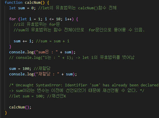 let 예약어를 사용한 변수는 재할당은 가능하지만 재선언은 불가하다.