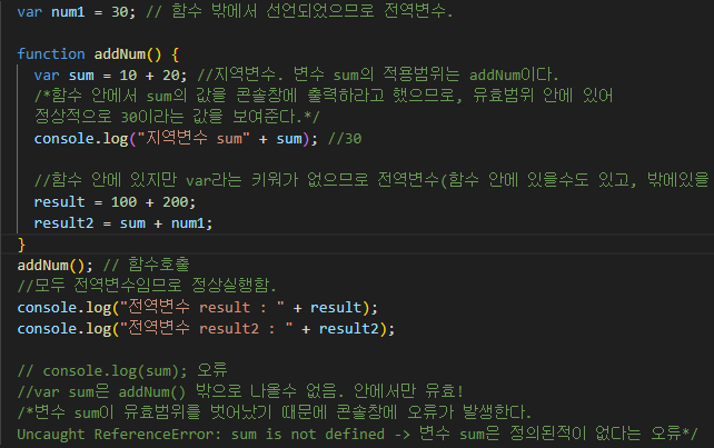 자바스크립트에서 변수를 선언하고 사용할 때 변수가 적용되는 유효범위를 '스코프(scope)'라고 한다. 즉, 변수가 어디까지 유효한지 가리키는 범위를 말한다(변수를 사용할수 있는 영역)