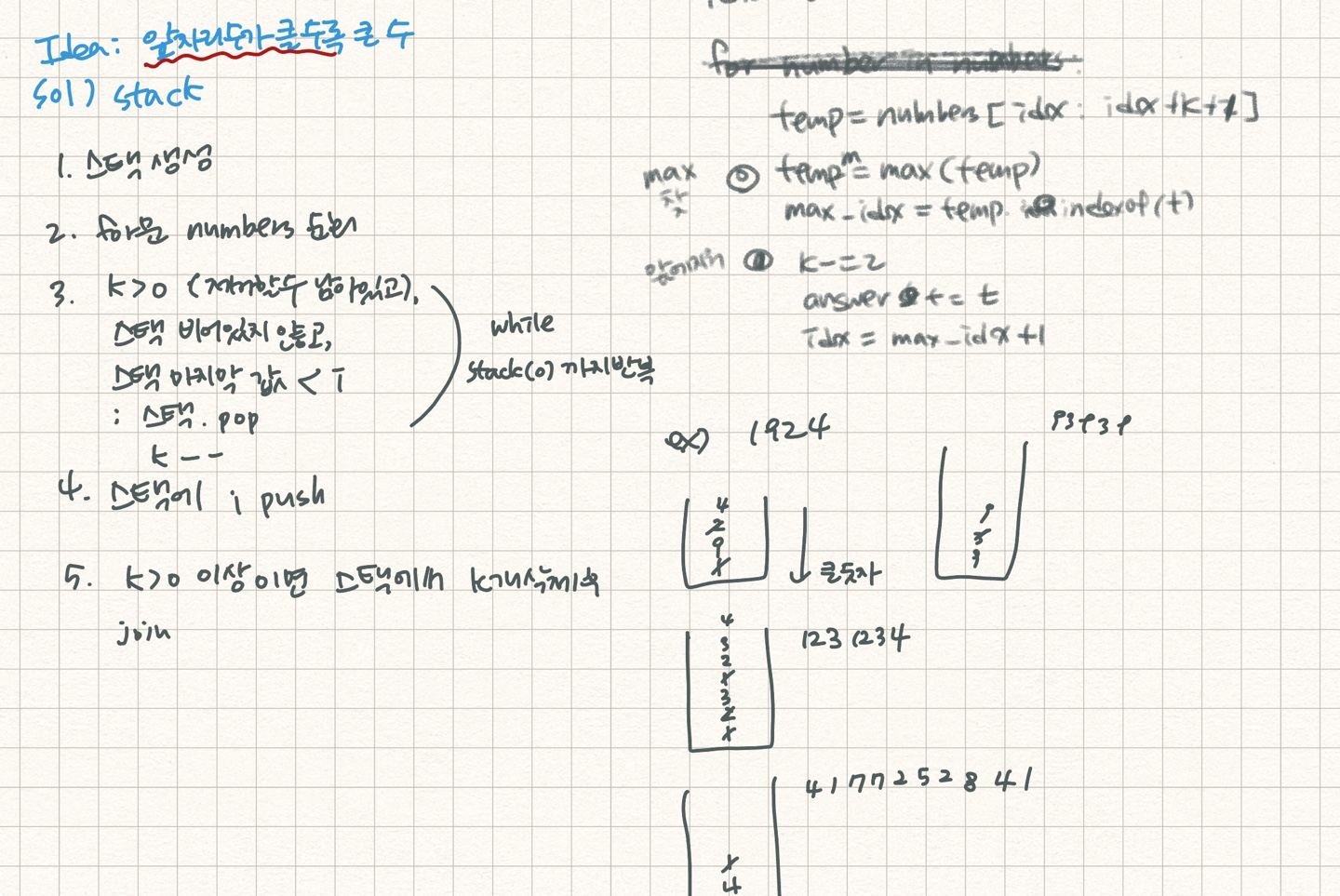 문제를 보자마자 "가장 앞자리에 가장 큰 수가 와야한다"라는 아이디어는 생각했는데, 그 뒤에 구현하는 부분에서 생각한 풀이가 달랐다. stack은 생각도 못해봤다. 그래서 stack 자료구조를 선택하여 풀이를 구상하는 과정을 찾아봤다.