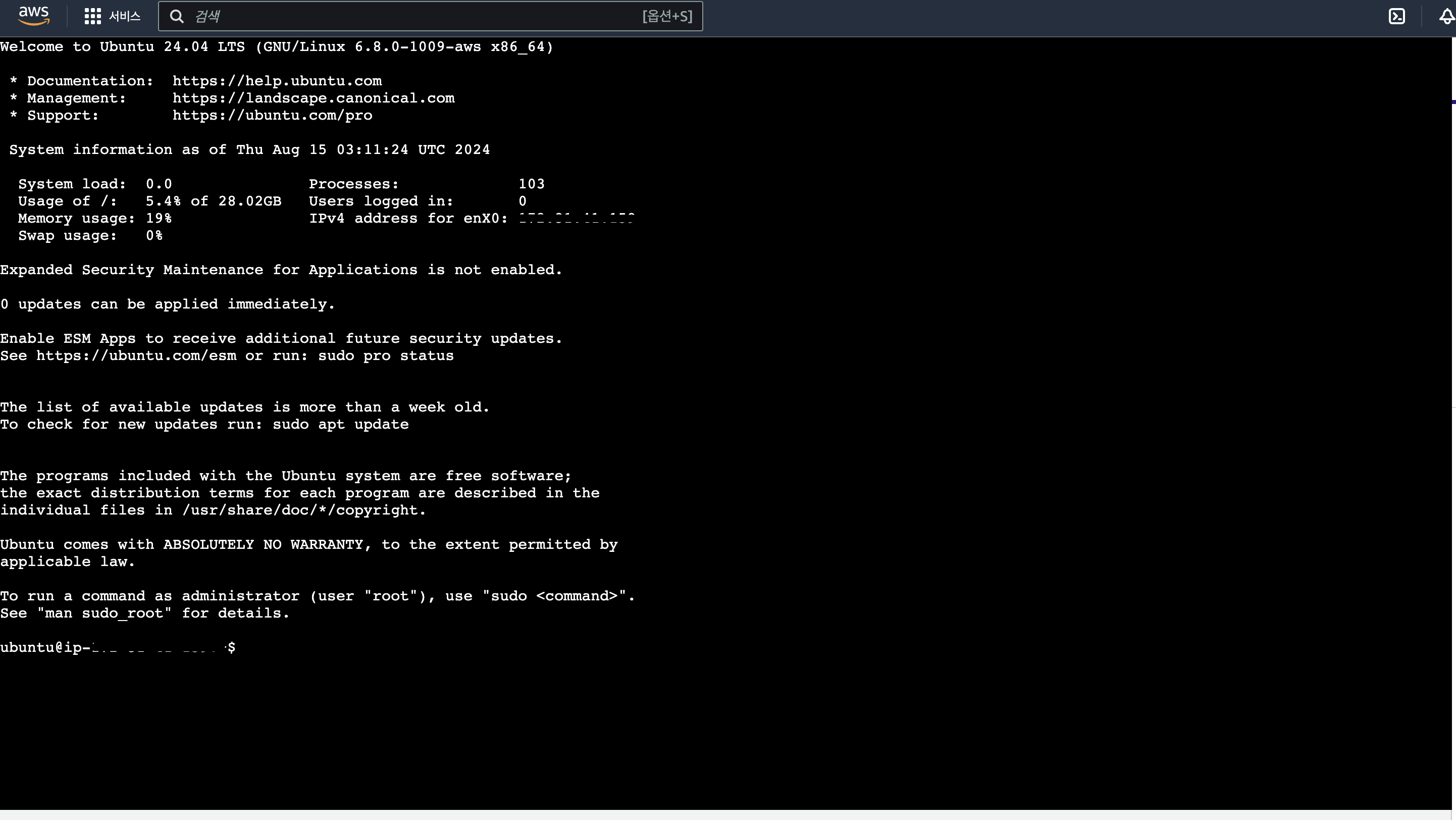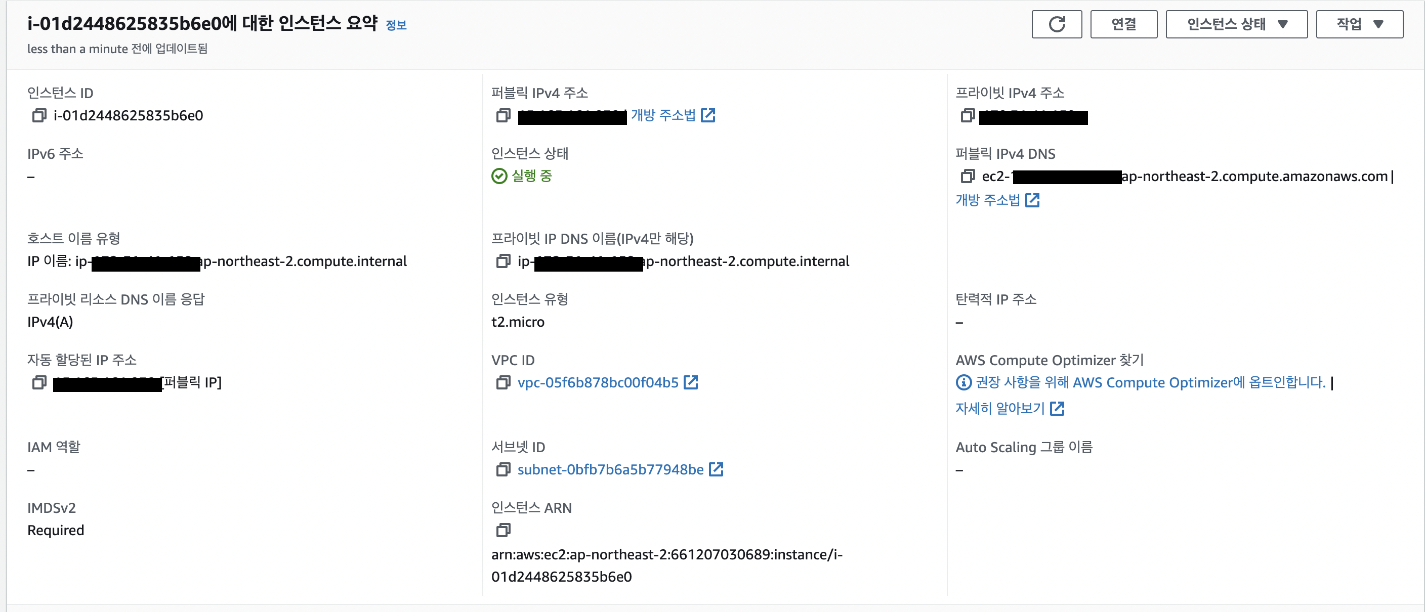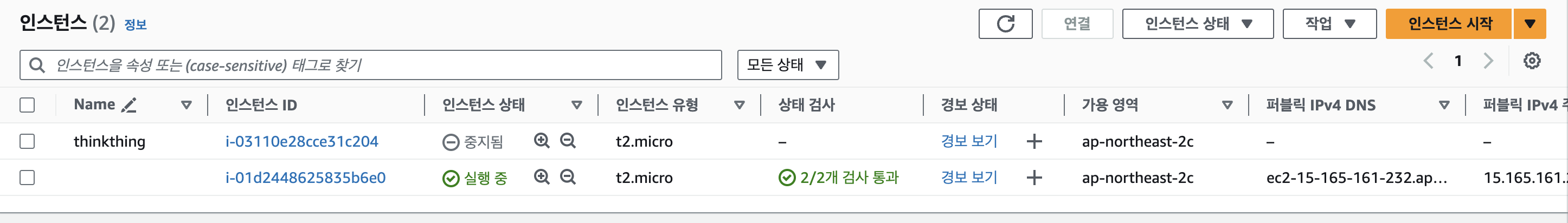 퍼블릭 IPv4 주소는 인스턴스를 실행/중지 할 때마다 바뀌기 때문에 주의해야한다.