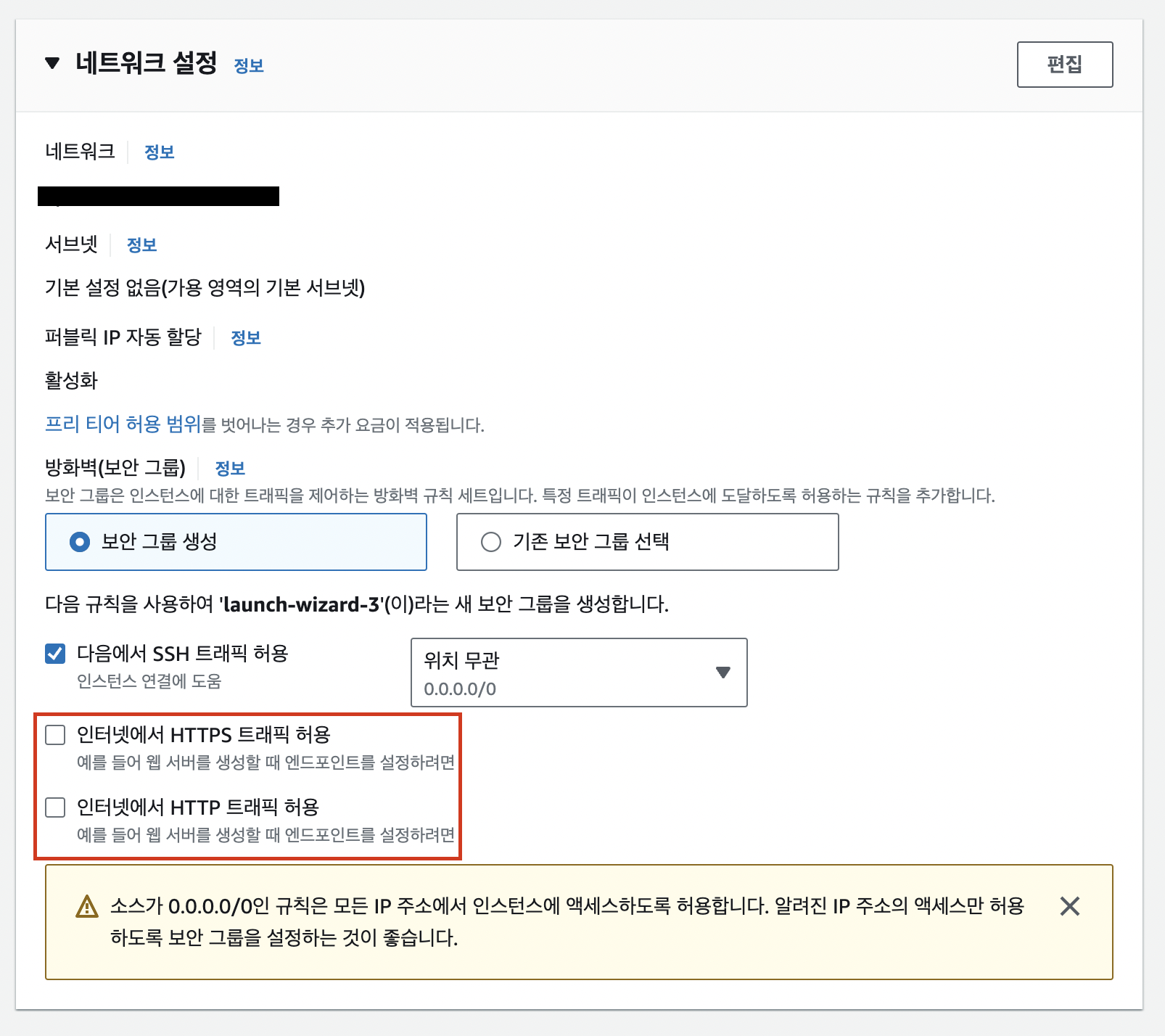 다음으로 네트워크 설정인데 이거는 HTTP/HTTPS를 쓸지 말지에 따라서 선택해주면 된다.