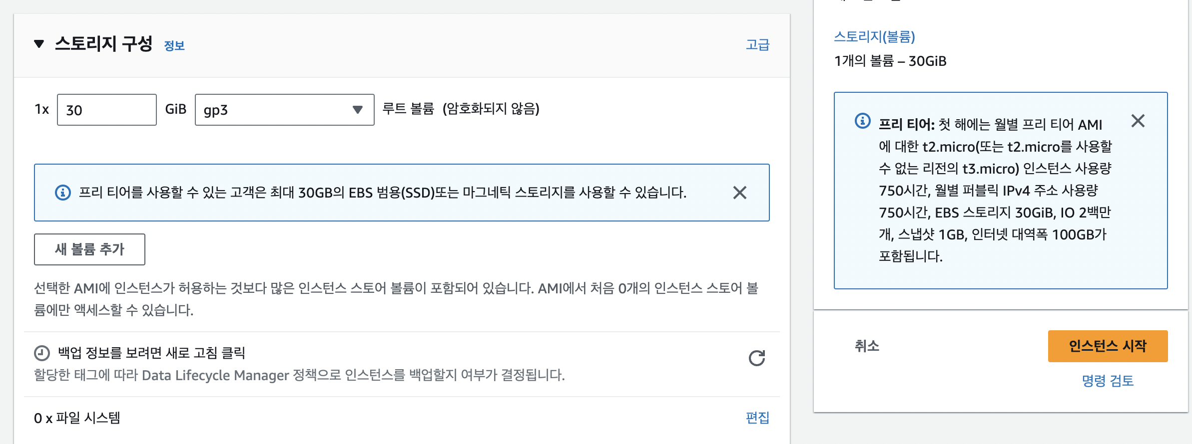 그 다음으로 스토리지 구성은 프리티어에서 최대 30GB이므로 30으로 설정해주면 된다.
