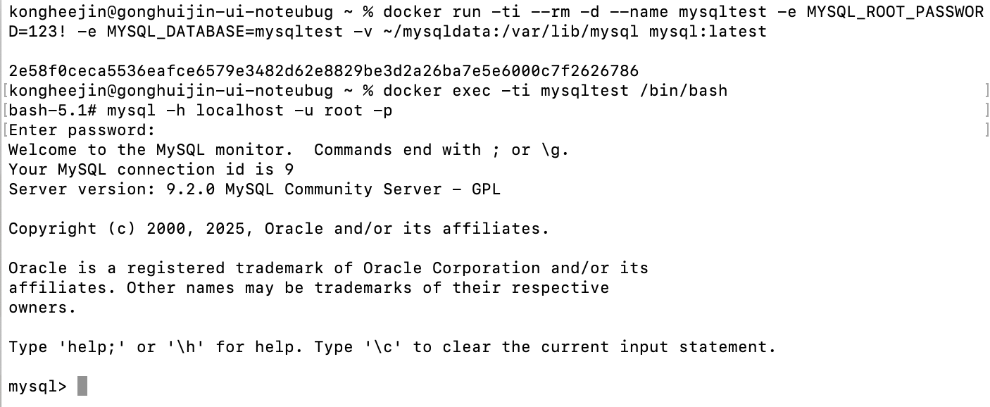 docker run -ti --rm -d --name mysqltest -e MYSQL_ROOT_PASSWORD=123! -e MYSQL_DATABASE=mysqltest -v ~/mysqldata:/var/lib/mysql mysql:latest