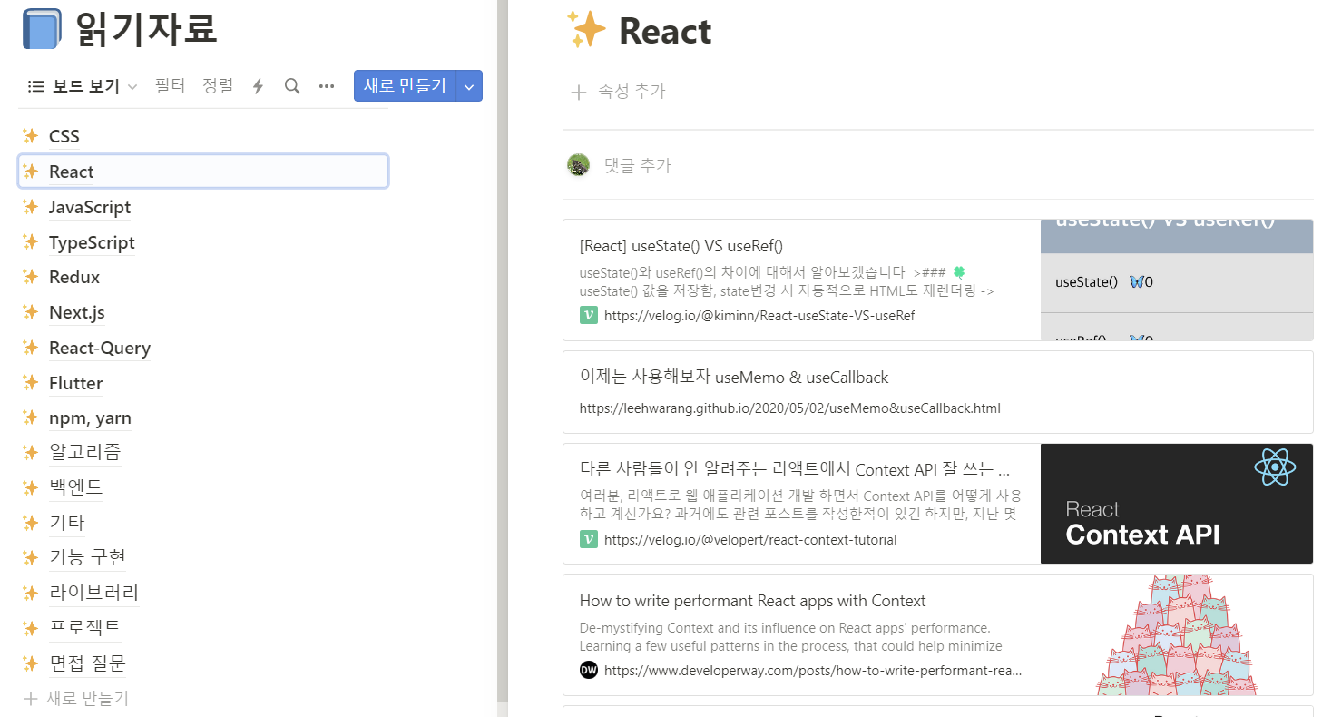 괜찮다 싶은 아티클들은 노션에 이렇게 카테고리를 나눠서 정리해 두고 있다.