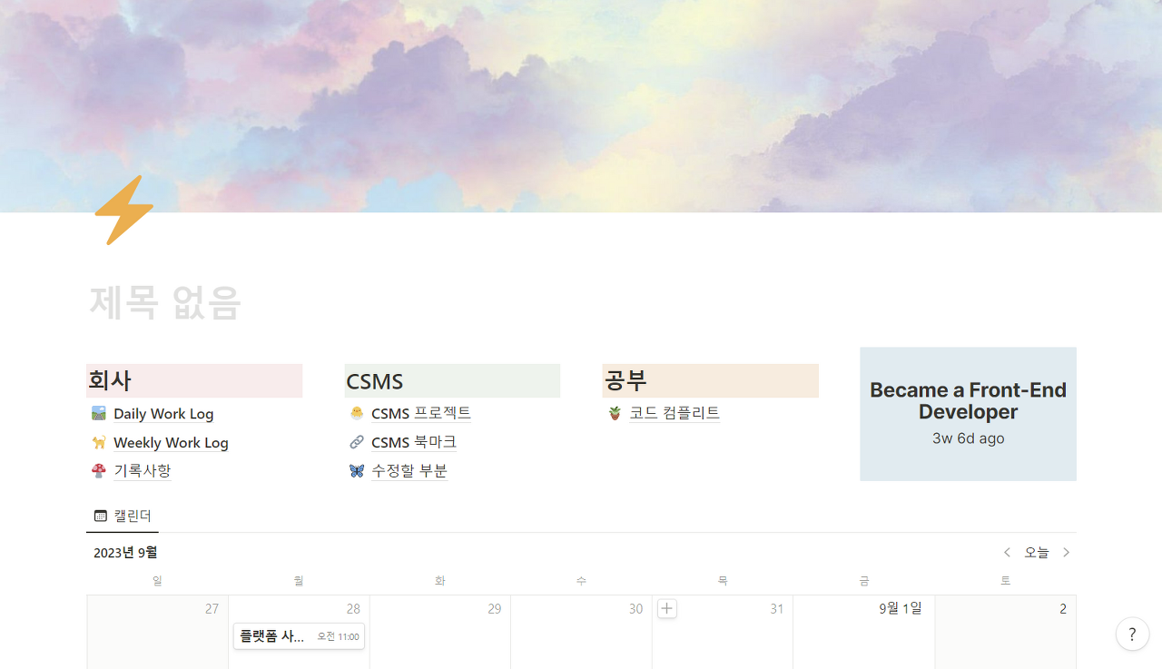 주말 동안 커버 이미지도 바꾸고 D-Day 위젯도 추가해서 나름 예쁘게 꾸민 회사 전용 노션 페이지 자랑하기 ㅋㅋ 앞으로 Daily Work Log를 주차별 태그로 나누는 부분도 추가하고 아직 작성하지 않은 Weely Work Log 페이지도 수정할 예정이다.